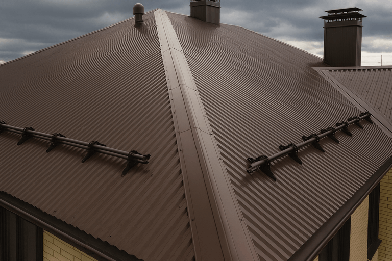 Крепим листы внахлёст оцинкованными саморезами с EPDM-прокладками, учитываем ветровую/снеговую зоны и направление укладки. - Доборы и финальная сборка