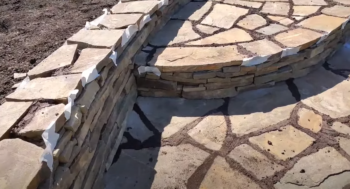 - Укладка и фиксация камня: на подготовленное основание кладутся плиты-плитняк, после чего они замещаются друг рядом с другом в заранее спланированной конфигурации.